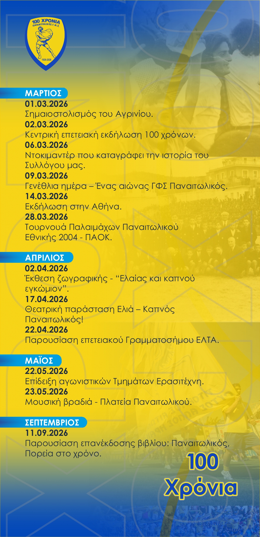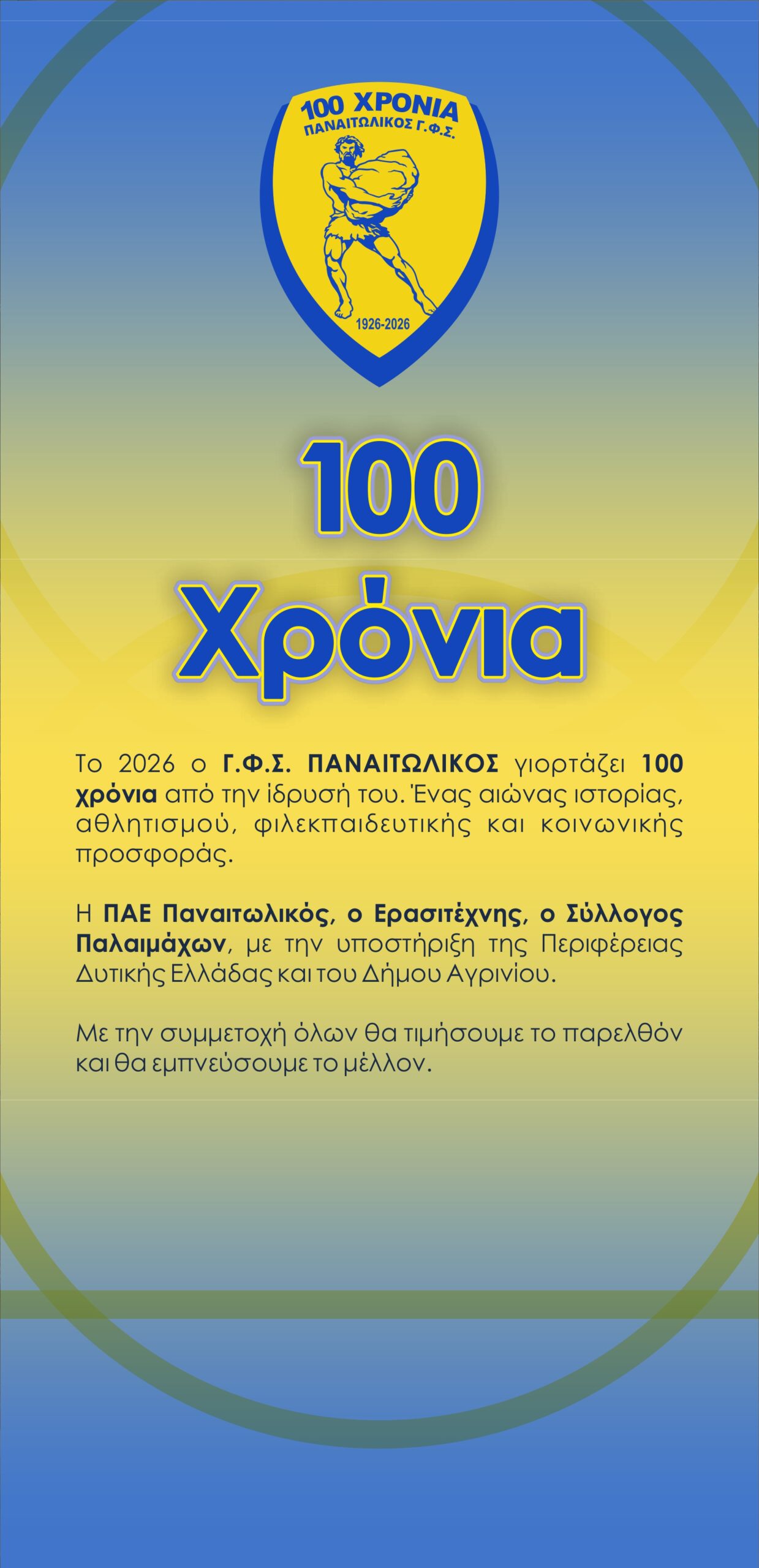 Ο Παναιτωλικός Γ.Φ.Σ συμπληρώνει 100 χρόνια από την ίδρυσή του και με σειρά εκδηλώσεων θα τιμήσει αυτή την μοναδική επέτειο.