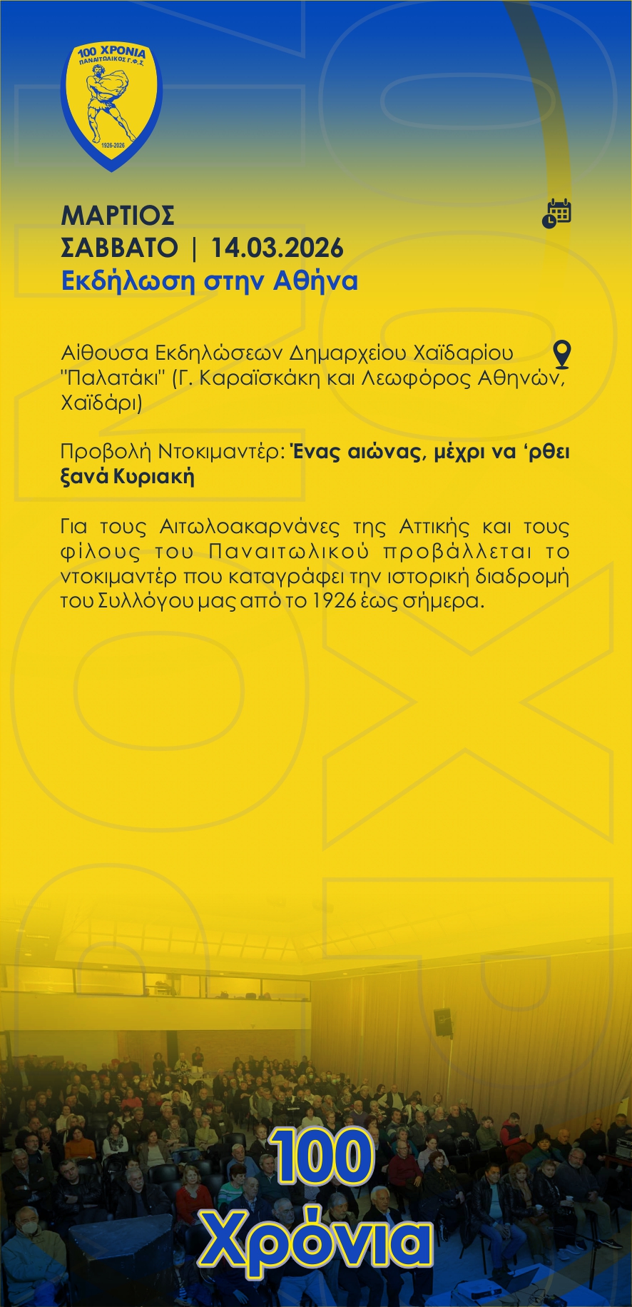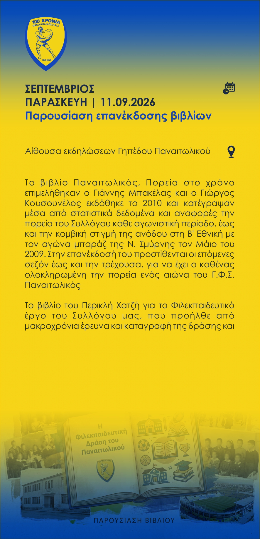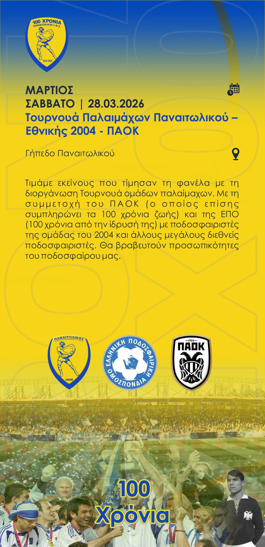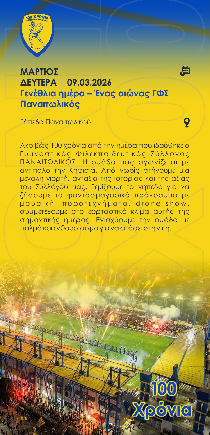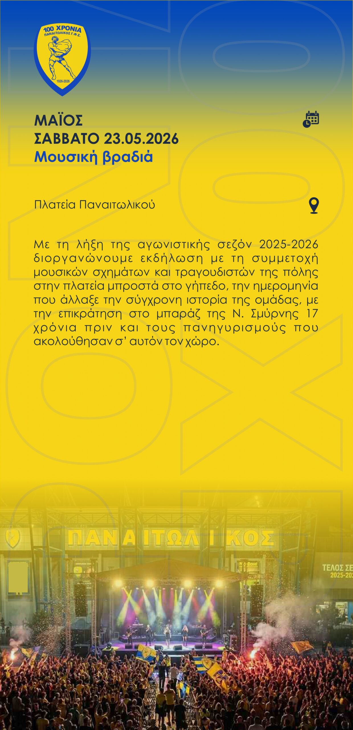 «Καλούμε τους Αγρινιώτες και Αιτωλοακαρνάνες να συμμετάσχουν στις εκδηλώσεις και να τιμήσουμε με υπερηφάνεια την ιστορία του Συλλόγου μας και όσους συνέβαλαν στη λαμπρή πορεία του ΠΑΝΑΙΤΩΛΙΚΟΥ μας αυτόν τον αιώνα», αναφέρει η ΠΑΕ Παναιτωλικός.