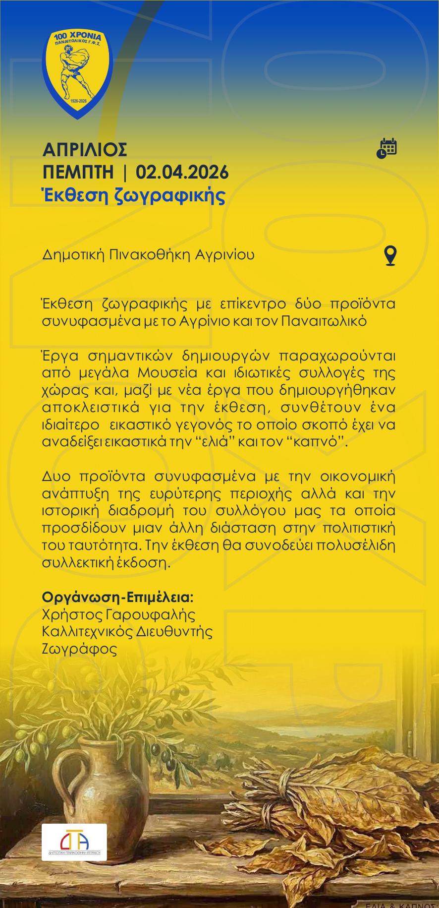 Θα ακολουθήσουν εκδήλωση με προβολή του ντοκιμαντέρ στην Αθήνα, τουρνουά παλαιμάχων με συμμετοχή των Legends του 2004, έκθεση ζωγραφικής, θεατρική παράσταση στο ΔΗΠΕΘΕ Αγρινίου, παρουσίαση γραμματοσήμων, επιδείξεις των τμημάτων του Ερασιτέχνη, μουσική βραδιά και επανεκδόσεις βιβλίων.