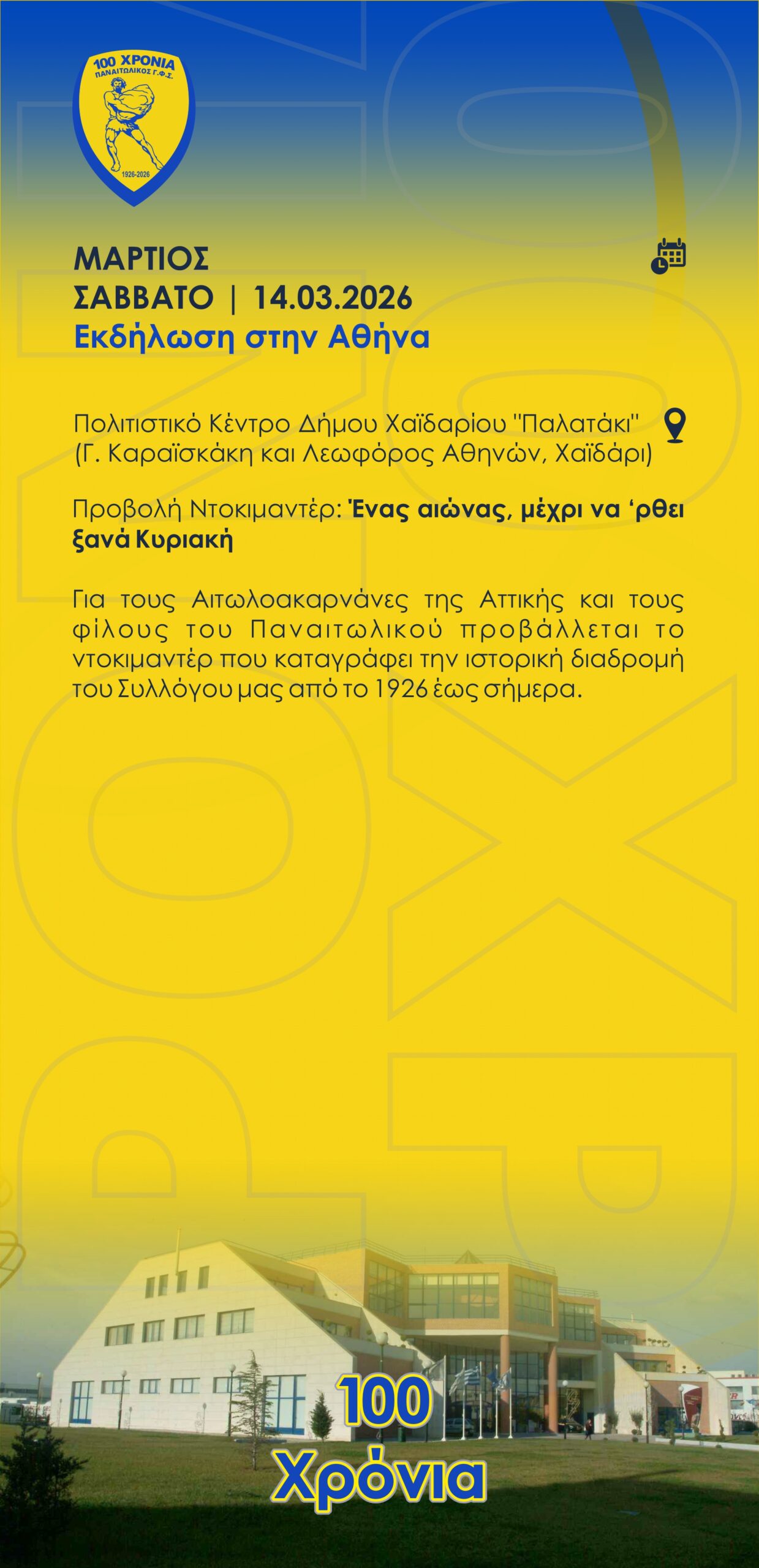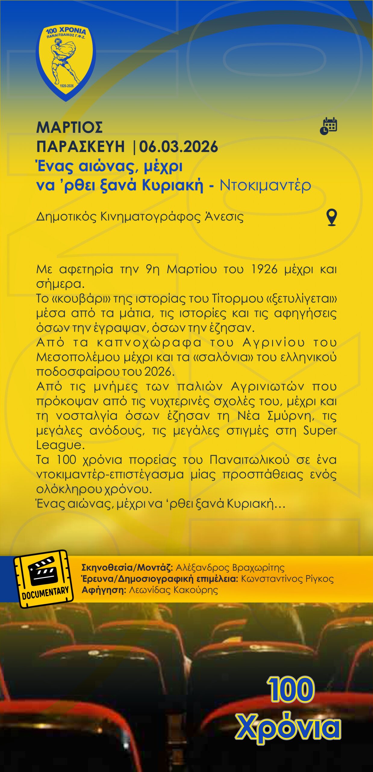 Στις 6 Μαρτίου θα προβληθεί ντοκιμαντέρ για τα 100 χρόνια του Παναιτωλικού με τον τίτλο «Ένας αιώνας μέχρι να ‘ρθει ξανά Κυριακή». 9 Μαρτίου, ημέρα γενεθλίων, αναμένεται φαντασμαγορικό σόου στο ματς-γιορτή με την Κηφισιά.