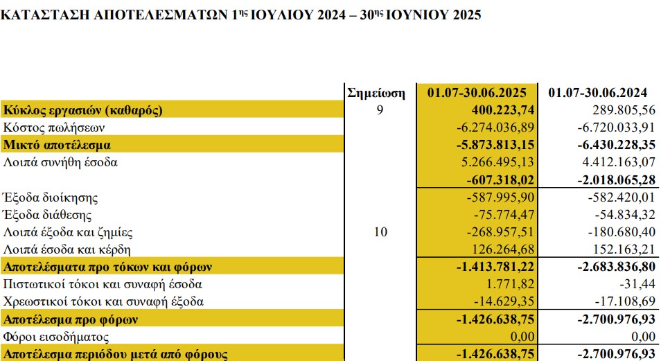 -Ο κύκλος εργασιών για το 2024/2025 ανήλθε σε 400.223,74 ευρώ έναντι 289.805,56 ευρώ το 2023/2024, παρουσιάζοντας αύξηση κατά 110.418,18 ευρώ.