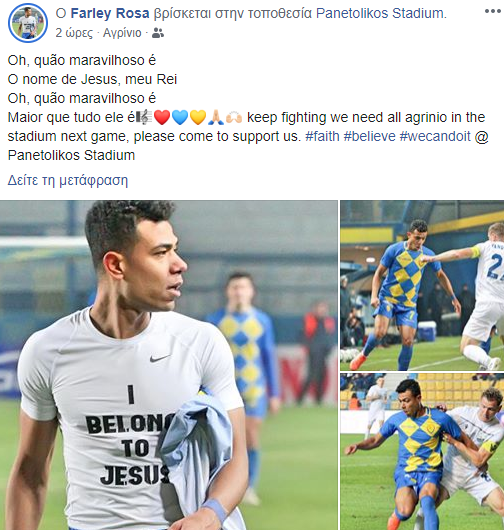 “We need all Agrinio in the stadium next game, please come to support us”, έγραψε ο Φάρλει στο Facebook του μετά τον αγώνα. Οξύμωρο.