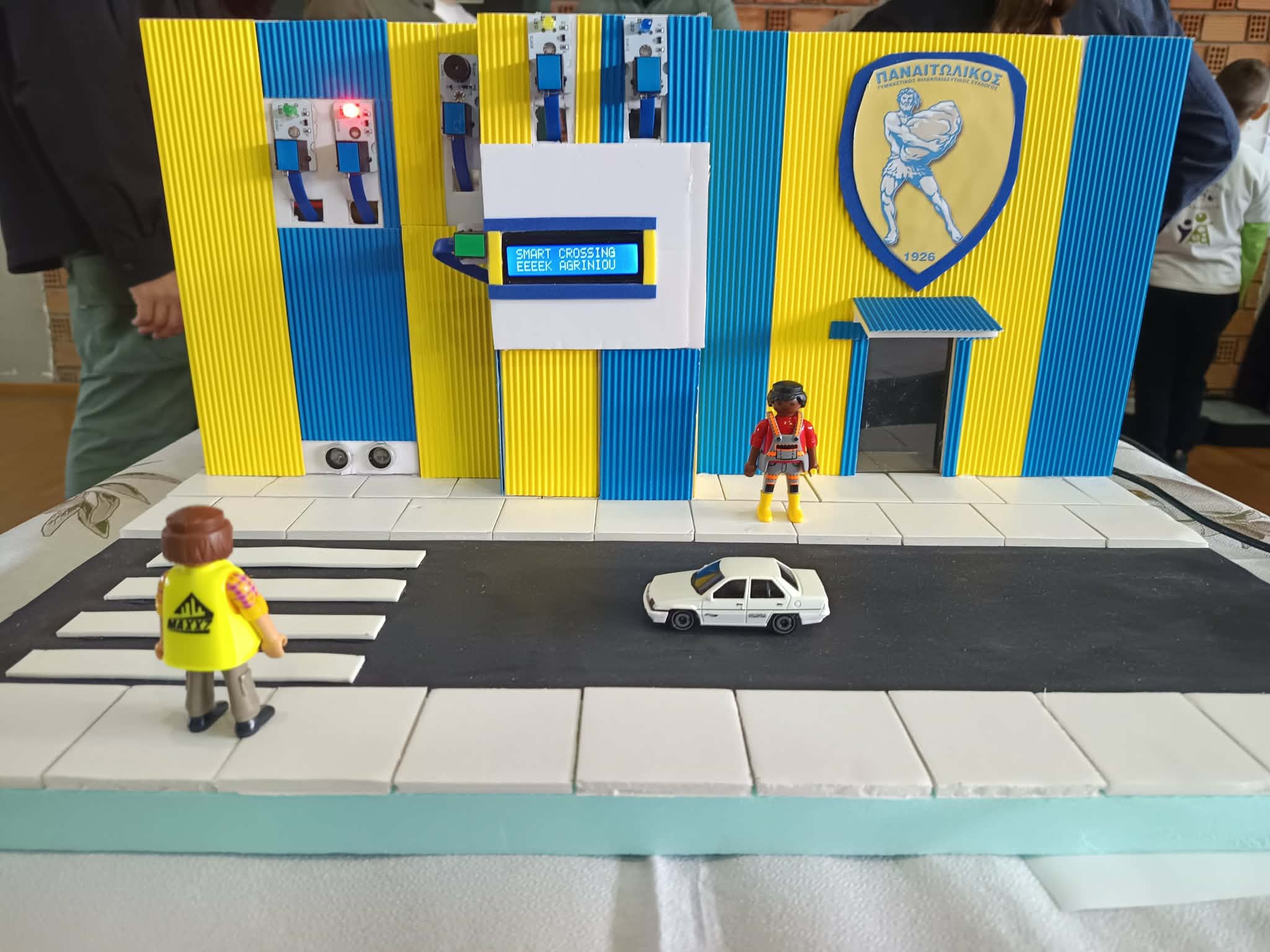 Οι μαθητές μας σχεδίασαν και προγραμμάτισαν μια πρότυπη διάβαση που συνδυάζει μοναδικά την τεχνολογία αιχμής με την κοινωνική ευαισθησία και την τοπική ιστορία του Αγρινίου. Μέσω ενός αισθητήρα υπερήχων, το σύστημα “αντιλαμβάνεται” την παρουσία του πεζού και ενεργοποιεί αυτόματα το πράσινο φανάρι, ενώ παράλληλα μια ψηφιακή οθόνη LCD καθοδηγεί το κοινό με μηνύματα ασφαλείας σε πραγματικό χρόνο.
