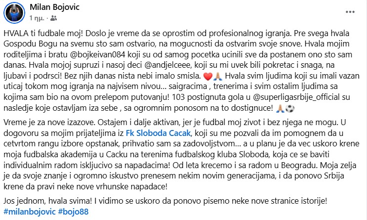 Ευχαριστώ όλους τους ανθρώπους που είχαν σημαντική επιρροή κατά τη διάρκεια του παιχνιδιού μου στο υψηλότερο επίπεδο… Συμπαίκτες, προπονητές και όλοι οι άλλοι άνθρωποι με τους οποίους ήμουν σε αυτό το όμορφο ταξίδι! 103 γκολ που σημειώθηκαν στο πρωτάθλημα της Σερβίας είναι η παρακαταθήκη που αφήνω πίσω, με μεγάλη υπερηφάνεια για αυτό το επίτευγμα!