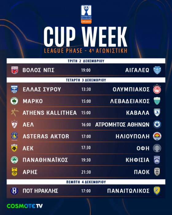 Το Κύπελλο Ελλάδας συνεχίζεται αρχής γενομένης από σήμερα, με τα παιχνίδια της 4ης αγωνιστικής της League Phase του θεσμού.