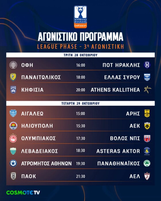 Με την διεξαγωγή της 3ης αγωνιστικής της League Phase συνεχίζεται η δράστη στον θεσμό του Κυπέλλου Ελλάδας.