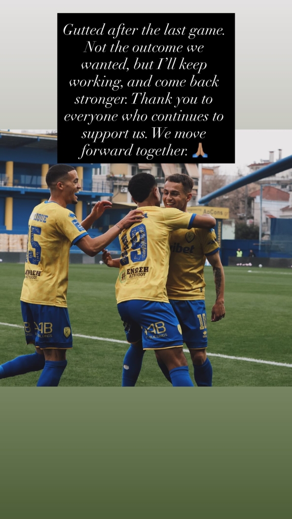 «Στεναχωρημένος μετά το τελευταίο παιχνίδι. Δεν ήταν το αποτέλεσμα που θέλαμε, αλλά θα συνεχίσω να δουλεύω και θα επιστρέψω πιο δυνατός. Ευχαριστώ όλους όσοι συνεχίζουν να μας στηρίζουν. Προχωράμε όλοι μαζί».
