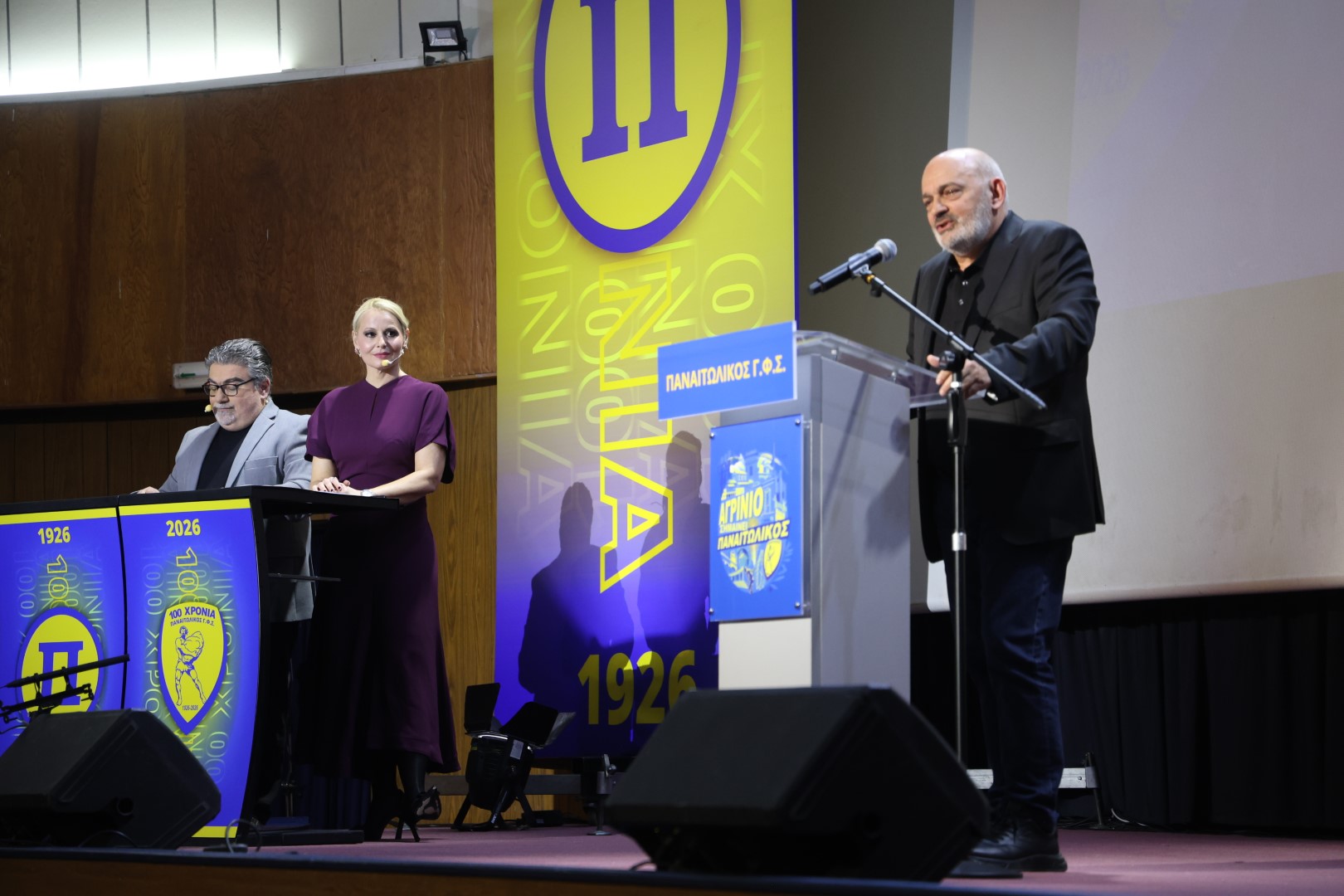 Ο πρόεδρος της ΠΑΕ Παναιτωλικός, Μάκης Μπελεβώνης, μίλησε στην κεντρική εκδήλωση για τα 100 χρόνια της ομάδας.