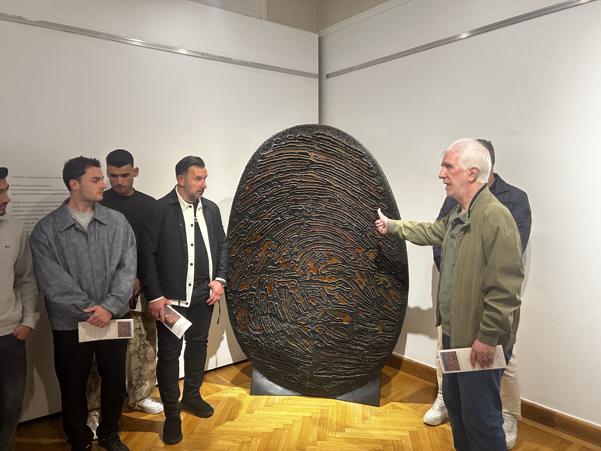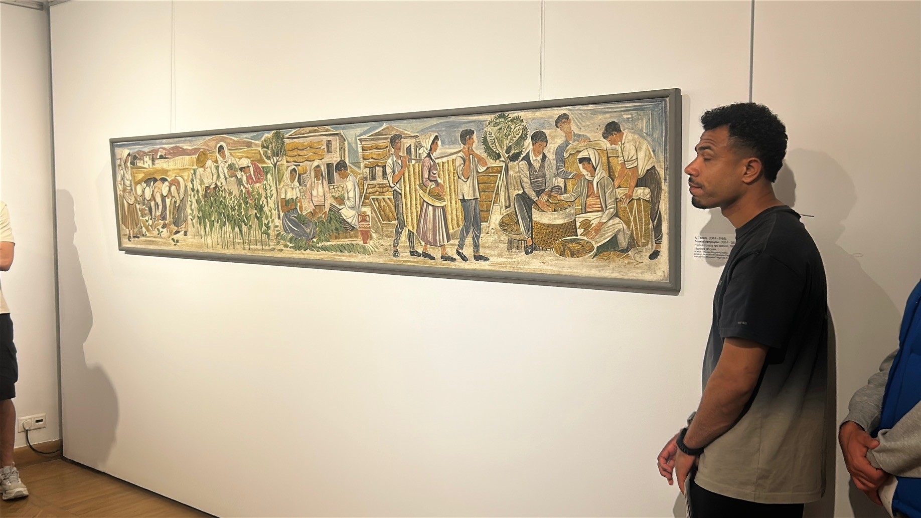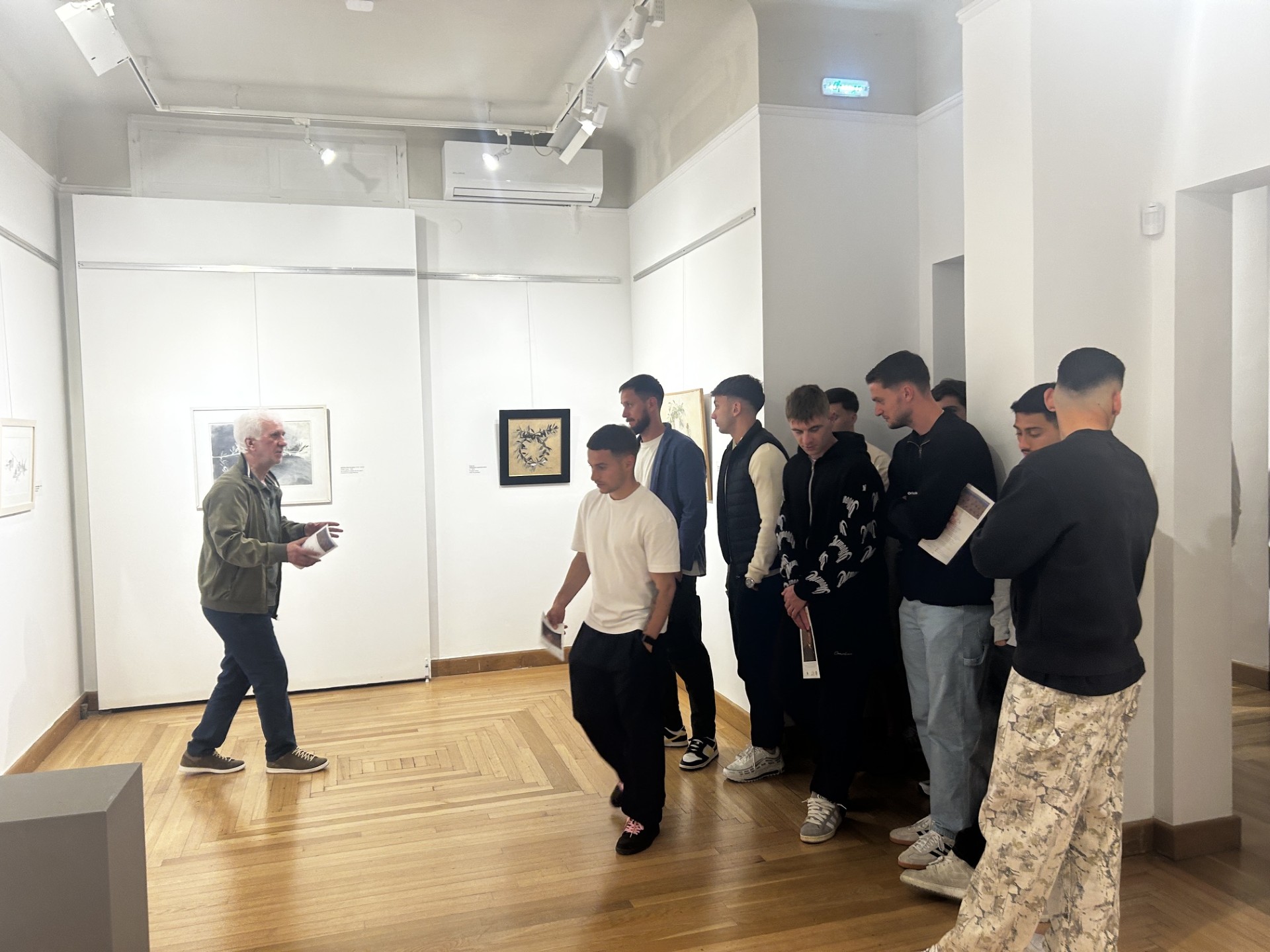 Ο υπεύθυνος της Πινακοθήκης Χρήστος Γαρουφαλής ξενάγησε την ομάδα στους χώρους της έκθεσης, παρουσία μεταφράστριας, δίνοντας τόσο το συνολικό υπόβαθρο όσο και λεπτομέρειες για κάθε έργο ξεχωριστά.