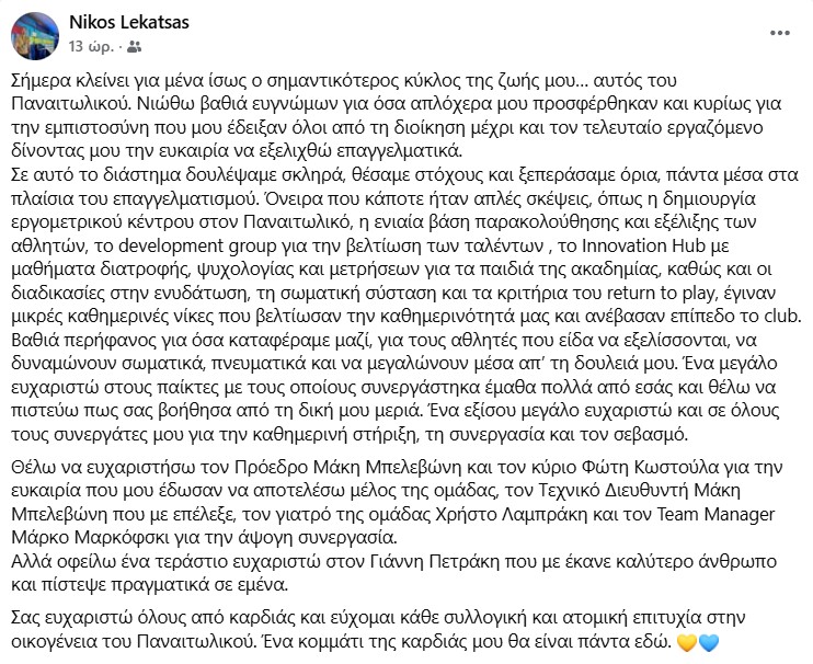 «Σήμερα κλείνει για μένα ίσως ο σημαντικότερος κύκλος της ζωής μου… αυτός του Παναιτωλικού. Νιώθω βαθιά ευγνώμων για όσα απλόχερα μου προσφέρθηκαν και κυρίως για την εμπιστοσύνη που μου έδειξαν όλοι από τη διοίκηση μέχρι και τον τελευταίο εργαζόμενο δίνοντας μου την ευκαιρία να εξελιχθώ επαγγελματικά.