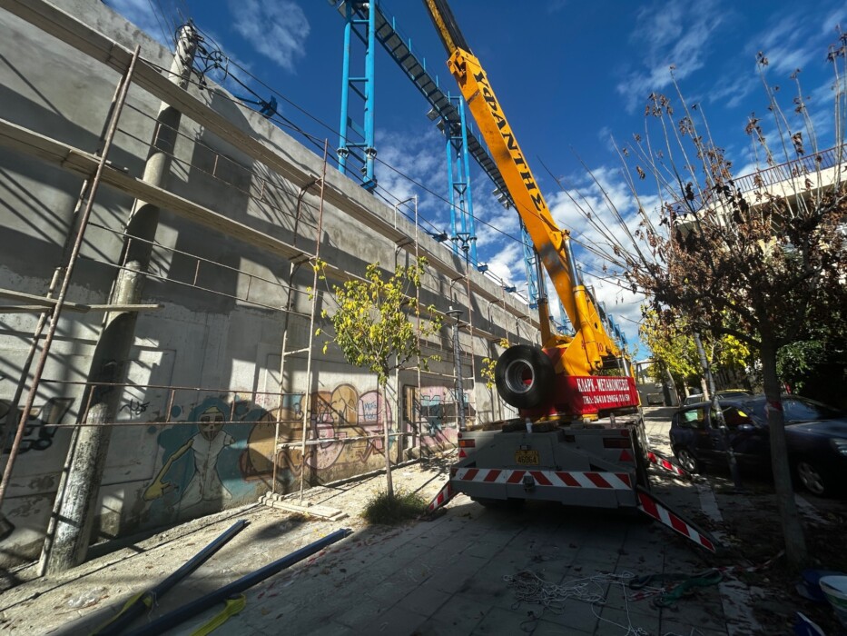 Η τοποθέτηση των επιμέρους τμημάτων του στεγάστρου με γερανό έχει ξεκινήσει, τη στιγμή που οι εργασίες συνεχίζονται και εσωτερικά.