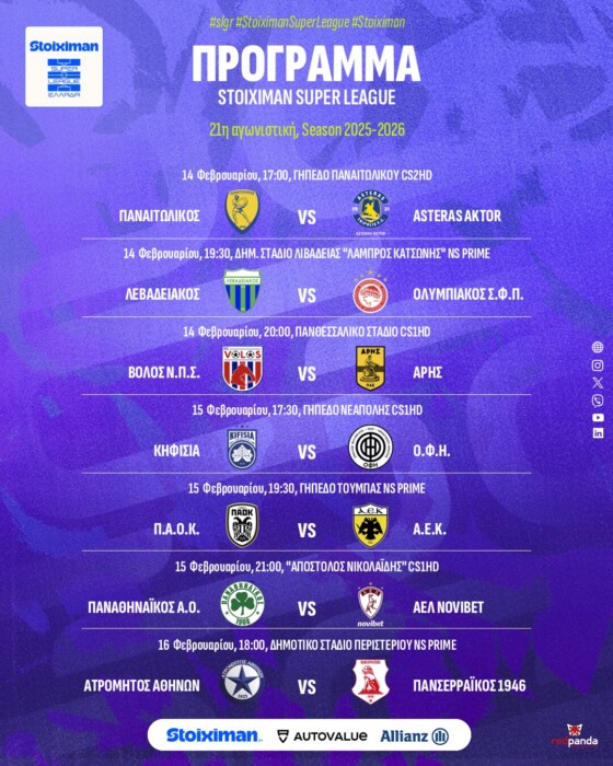Κυριακή 15 Φεβρουαρίου στις 17:30 Κηφισιά-ΟΦΗ. Δύο ώρες αργότερα, ντέρμπι δικεφάλων, ΠΑΟΚ-ΑΕΚ. Στις 21:00 Παναθηναϊκός-ΑΕΛ.