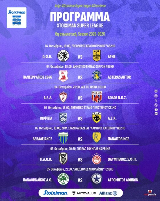 Σέντρα σήμερα Σάββατο 4 Οκτωβρίου στην 6η αγωνιστική της Super League με κομβικά παιχνίδια ενόψει και της διακοπής για τις υποχρεώσεις των εθνικών.
