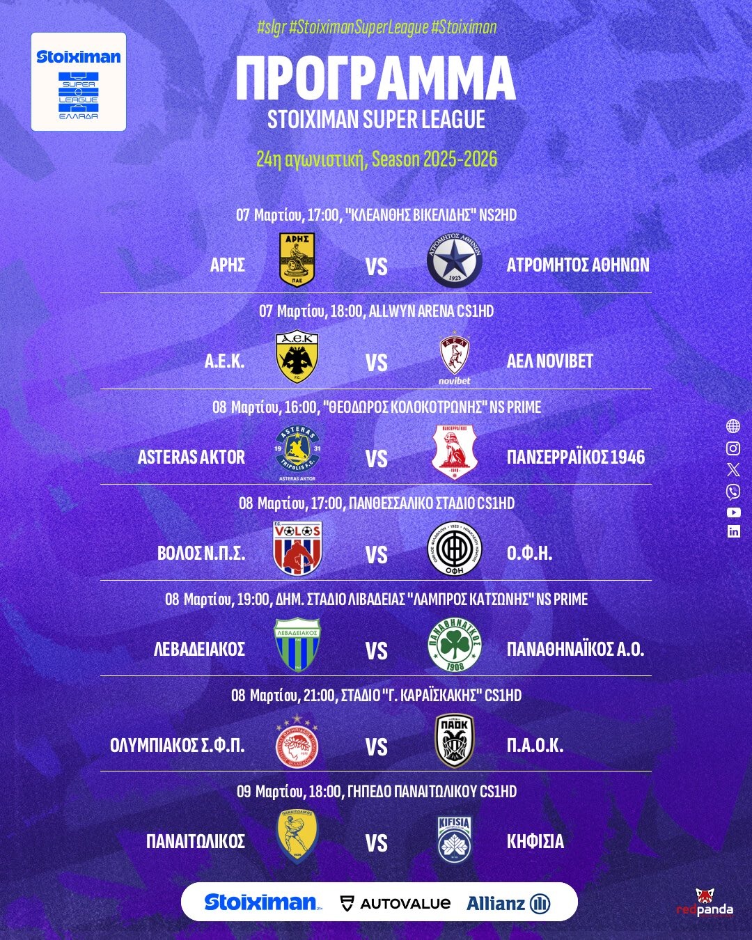 Σήμερα 7 Μαρτίου στις 17:00, Άρης-Ατρόμητος. Στις 18:00 ΑΕΚ-ΑΕΛ.